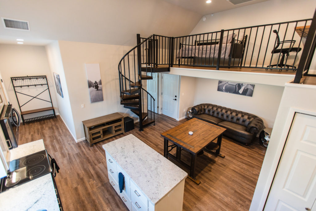 It’s finally here! We’ve been working on this for quite some time now, but we think the final result was worth the wait. The two bedroom (plus loft), one bathroom house features modern amenities including black stainless appliances, a rain fall shower, integrated entertainment system, granite counters, spiral staircase, memory foam mattresses, desk areas, full size washer and dryer, central heat and air, high speed internet and much more.